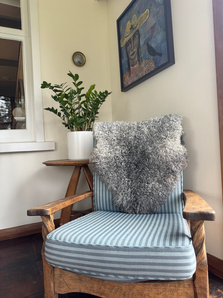 Every pelt is 100 percent natural, undyed and completely unique. There are beautiful, natural colour variations — from a light, silvery white, through to a steely grey and then onto a deep midnight black. The fleece’s signature curl and length changes from pelt to pelt, but every sheepskin has a luxurious super-soft texture and lustrous glow. The natural suede is incredibly supple and falls beautifully when hung over a chair or sofa.